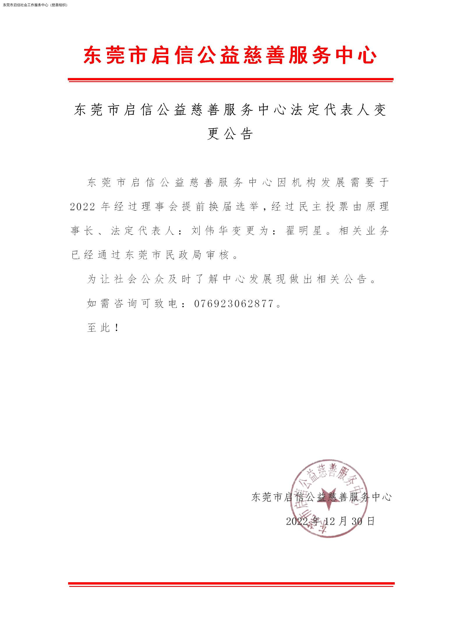 东莞市启信公益慈善服务中心法定代表人变更公告