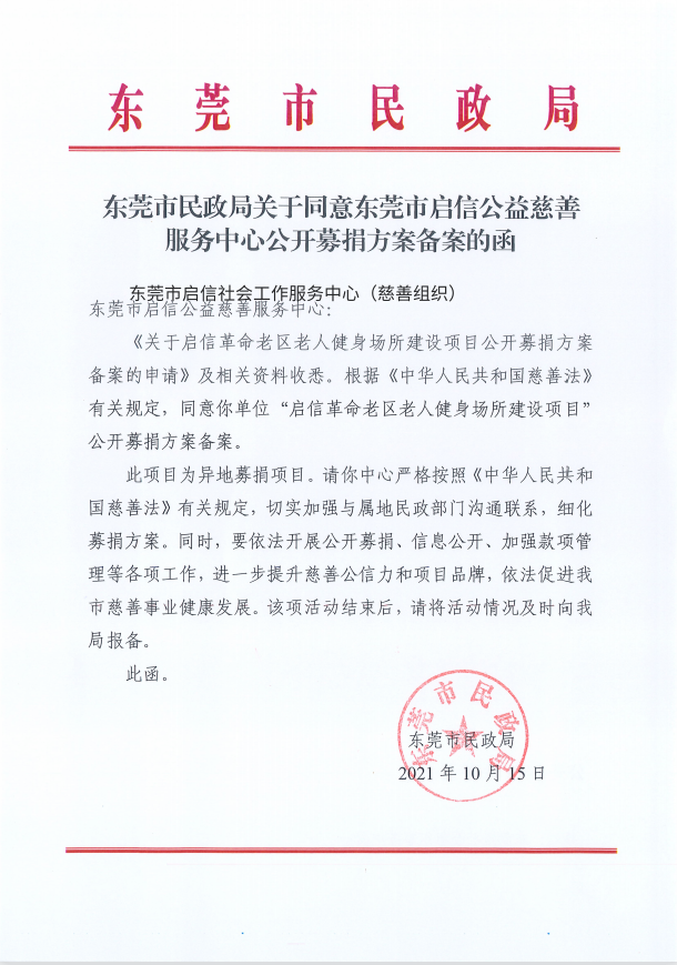 东莞市启信公益慈善服务中心将发挥慈善组织功能,让革命老区老人家们老有所乐,呼吁社会各界人士给老区老年人的晚年健身活动提供支持。