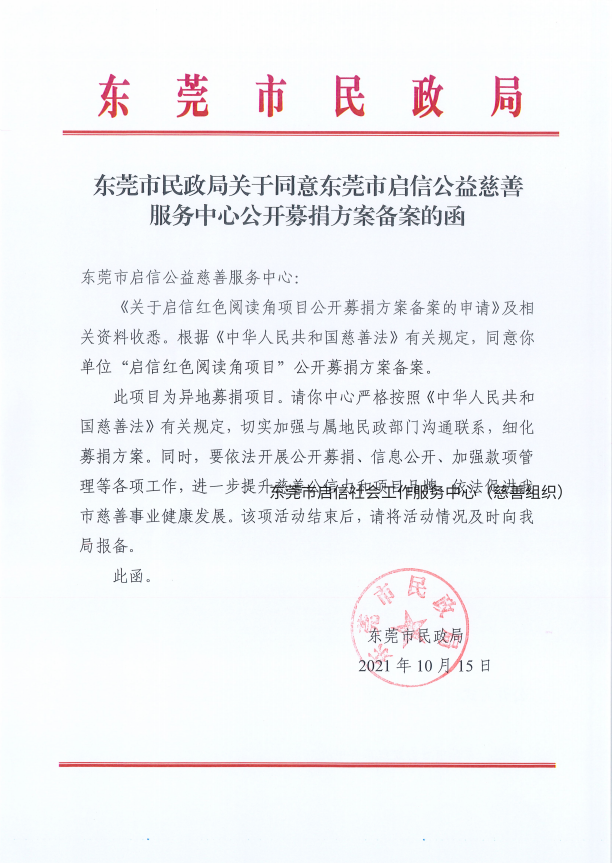 捐款时请注明“红色阅读角项目”。因银行划账时没有地址记录,请爱心人士划账捐款后务必复印汇款回执,并在复印件上附写捐款人姓名、地址、邮编、联系人及电话后,发(寄)送到东莞市启信公益慈善服务中心,以便邮寄捐赠发票。
