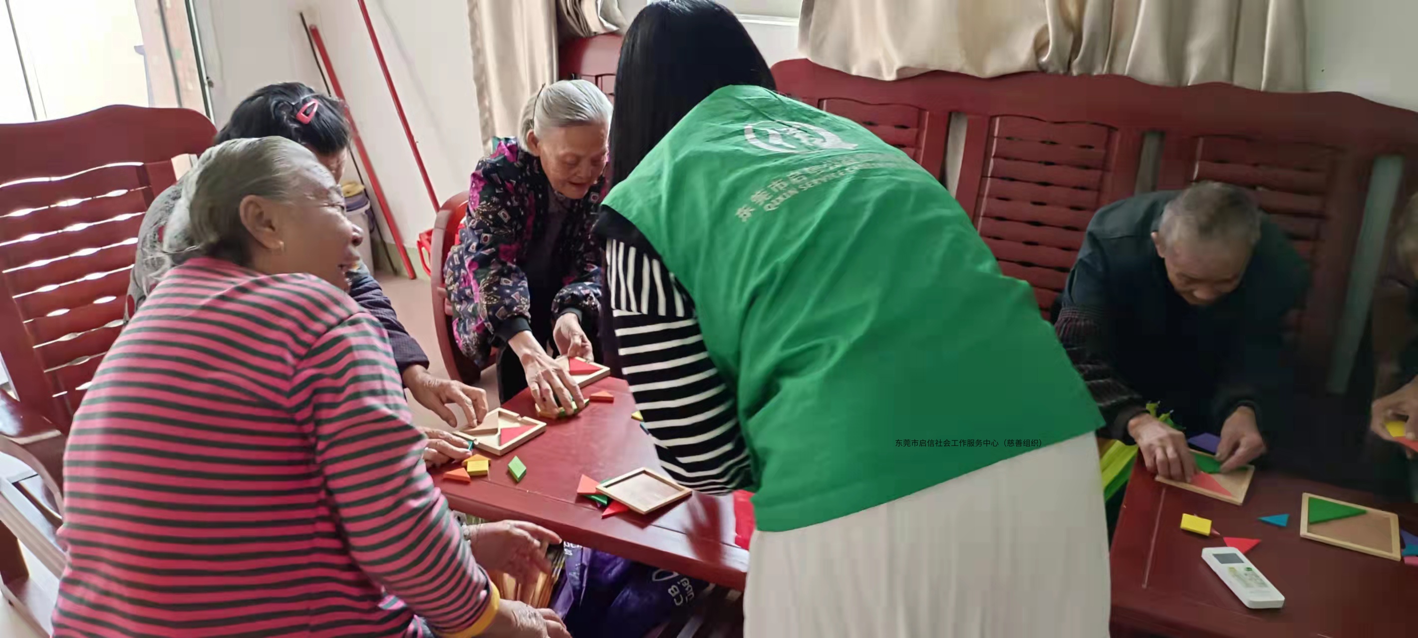 活动当天有细微的小雨,但也不能阻碍服务对象们参加活动的积极性,服务对象们都准时到达活动现场。活动开始,社工了解务对象们的一些基本情况,最近的身体情况,为服务对象测量血压等等。接着社工向参与者介绍本次活动内容,先向参与者讲解七巧板的玩法,参与者并不是很快能够掌握,但参与者们很有耐心学习,并主动去拼七巧板。在参与者自己尝试过后,社工组织七巧板比赛,参与者就像小朋友一样,为了想要赢的比赛,着急得直跺脚。