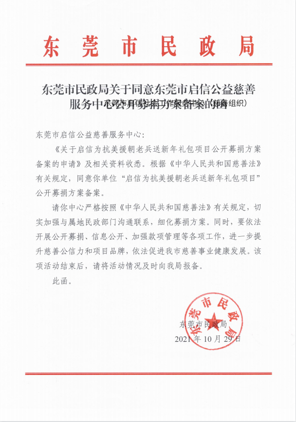 捐款时请注明“抗美援朝老兵送新年礼包项目”。因银行划账时没有地址记录,请爱心人士划账捐款后务必复印汇款回执,并在复印件上附写捐款人姓名、地址、邮编、联系人及电话后,发(寄)送到东莞市启信公益慈善服务中心,以便邮寄捐赠发票。