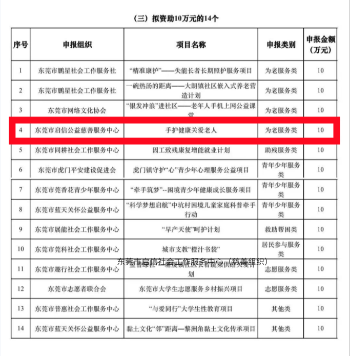 【东莞启信】《手护健康 关爱老人》项目荣获东莞市慈善会第二届公益创投活动资助