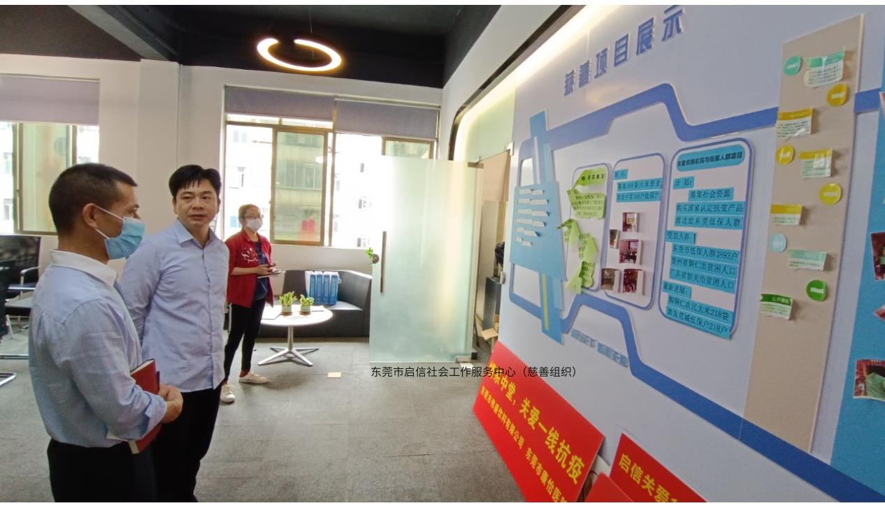 东莞市社会捐赠接收站肖站长一行莅临启信参观指导。肖站长了解启信情况后,对启信公益慈善服务中心的多年对公益贡献表示肯定,同时了解到中心面对的困难,再接下来的接收站可与启信进一步合作,为求帮助社会更多有需要的群众。